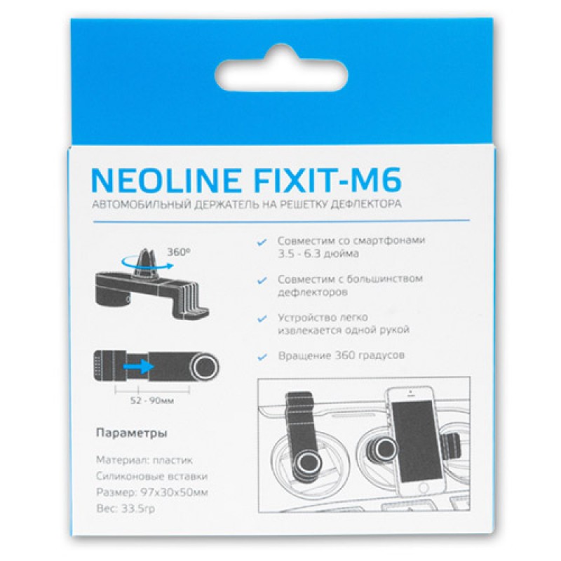 Neoline Fixit-M6 - автомобильный держатель для мобильных устройств с установкой на решётку дефлектора. Фиксирует смартфоны шириной от 55 до 74 мм. Позволяет вращать смартфон на 360 градусов. Только высококачественные материалы и мастерство производителя создают простые и надежные аксессуары Neoline. В своем постоянном поиске новых решений производитель Neoline стремится исполнить мечту каждого автомобилиста – создать универсальное устройство.